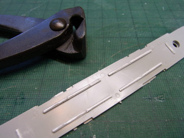 次の作業のことを考え、錘止めを切り取ることにしました。まず喰切りで大雑把に切除し更にデザインナイフで切り落とします。