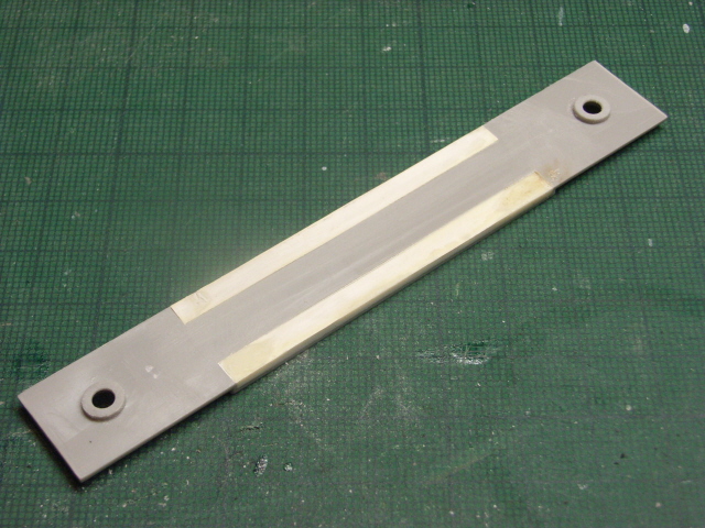 やはり気になるので、手持ちのプラペーパー0.14ミリをタミヤの緑キャップで接着。しばし放置の後、平滑にするためにヤスリがけを行いましたが、まだ乾燥が完全ではなかったようで一部が剥がれてしまいました。