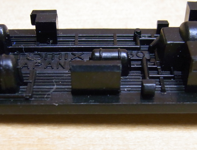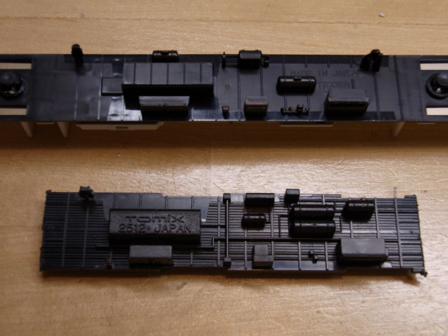 最後に、ジャンク箱からTOMIXのマニ50の床下を探してきました。2000番台と2100番台でこれだけ床下機器の配置が違うんですね。以前製作したマニ50 2223の床下が出鱈目だということがわかり、ショックです。