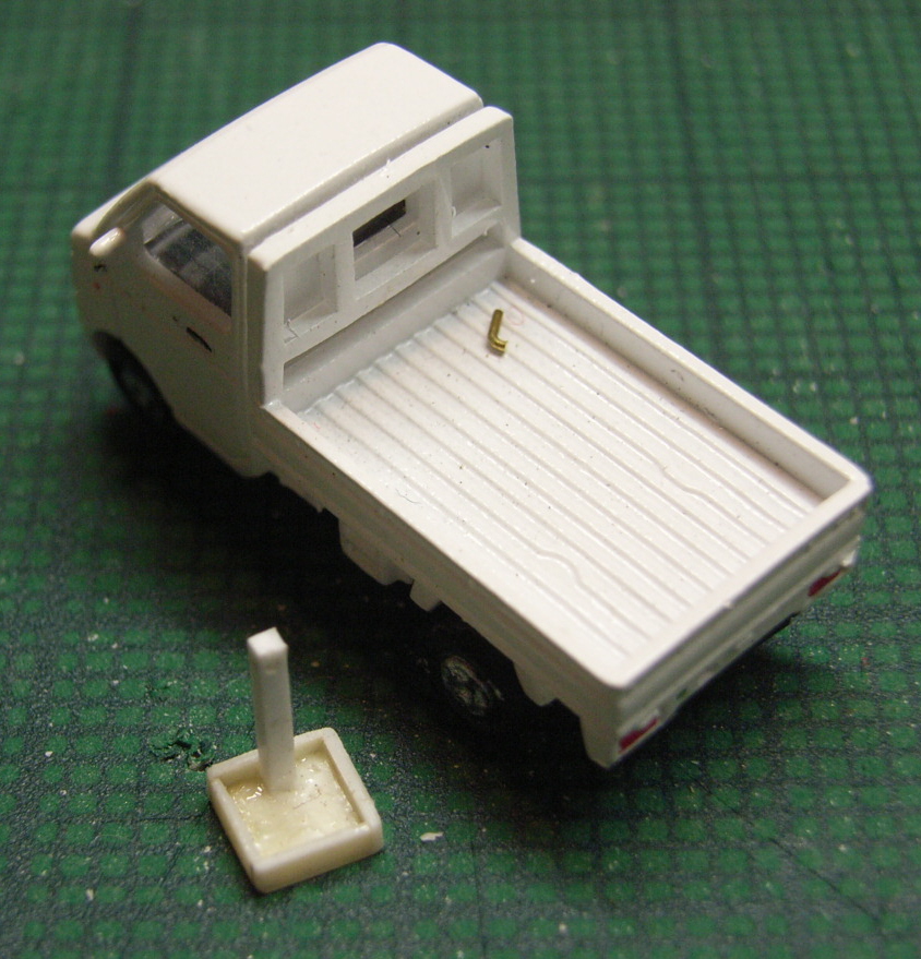 スプレーでグレーを吹いたあと、軽トラックの荷台の上に有る曲がった真鍮線を蛇口として取り付けて完成です。