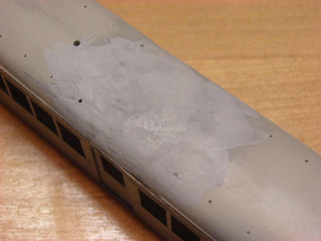 そこで、「屋根上と台車の工作」のエントリ上部右側の画像のように、 光硬化パテと自作パテを使い修正を図りました。しかし脂汚れ等は取った上でパテを載せたにもかかわらず乾燥後のヤスリがけで一部が剥離してしまいました。