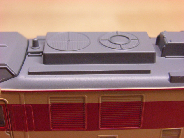 車体は完全に別物です。屋根は旧製品では、運転室の上の部分だけが別パーツとなっていましたが、全部の屋根が外れるようになり、更にクーラーや新鮮外気取入装置が別パーツになり、ランボードも足が付きました。さらに、メッシュ表現のみだった機器室上の送風機には、その下のファンもモールドされました。