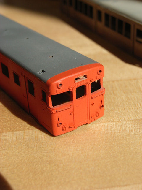 今日、車体と床下の合いを確認した際に、内張りの一部が剥がれてしまいました。そのとき使った瞬間接着剤が、不注意で車体側面に4箇所程付着してしまいました。ペーパーがけして、一部取り除きましたが艶が出てしまって目立ちます。失敗の痕は、左の画像をご覧頂けば一目瞭然です。