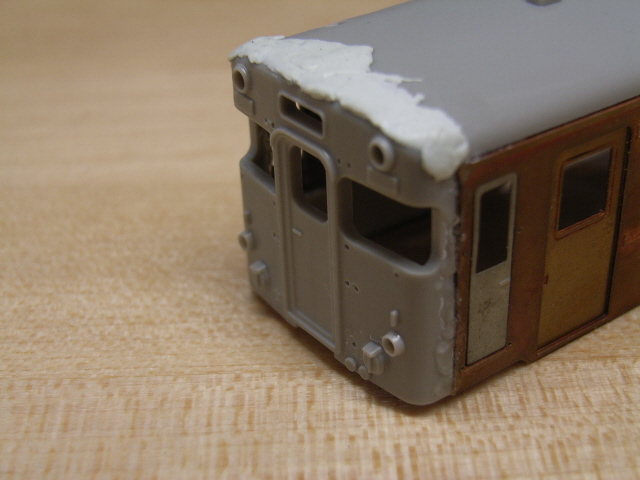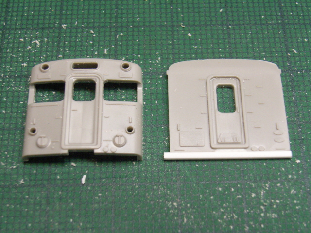 というのは、ステップ付きの出入り口が車端にあるキハ46と、中心寄りにあるキハ45では妻面の形状がステップの高さ分違っているからです。説明書にはそんな記載はありませんが、このまま無視して工作を進めれば後悔する事は目に見えているので加工します。